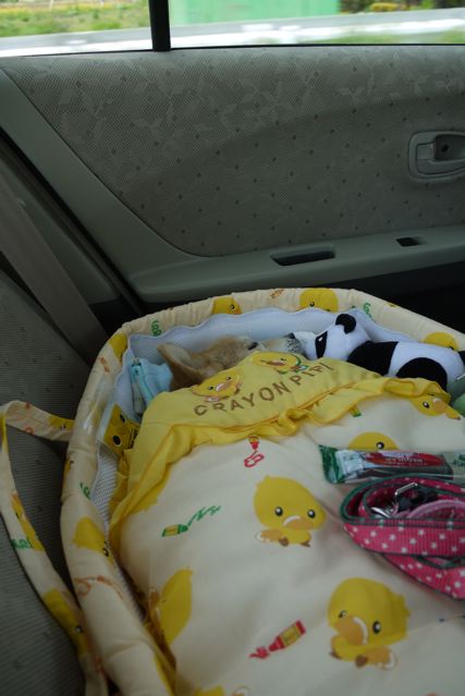 おしっこはまだ自分で出来ますが、車や待合室ではクーハンが大活躍です。